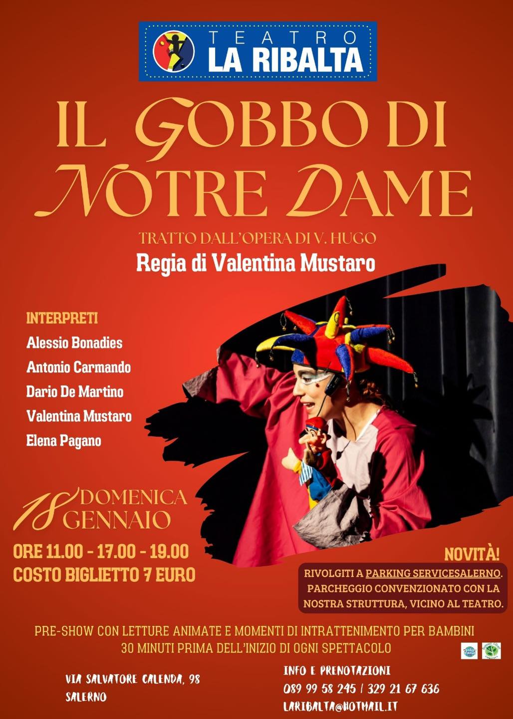 Il Teatro La Ribalta di Salerno riporta sul palcoscenico uno dei capolavori più amati della letteratura francese: “Il Gobbo di Notre Dame”, tratto dall’opera di Victor Hugo e diretto da Valentina Mustaro. Lo spettacolo è inserito nella rassegna dedicata ai più piccoli “Piccole Emozioni”, pensata per avvicinare i bambini al mondo del teatro attraverso storie intramontabili, personaggi indimenticabili e un forte valore culturale ed educativo.